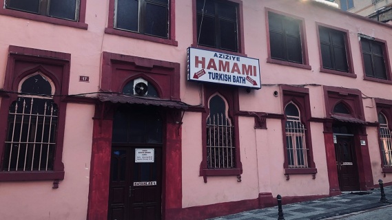 İlk durağımız 1860’lardan kalma Aziziye Hamamı. Osmanlı padişahı Sultan Abdülaziz’in son yıllarında yapılmış. Erkek ve kadın bölümleri simetriktir. İçi eski tarz kireç sıvayla kaplanmış. Higroskopik malzeme (sıvı ve katılar maddelerden su uzaklaştırmak amacıyla kullanılan malzeme) olan kireç gündüz hamam çalışırken oluşan rutubeti emer, gece çalışmazken kusar. 1950’li yıllara kadar Yahudi kadınları cuma geceleri burayı kapatarak tevilla yaparlarmış. Tevilla Yahudilerin kutsal cumartesi günü için temizlenmelerine denirdi.